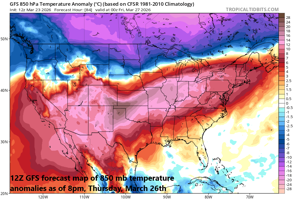 The 2026 season gets underway with one game on Wednesday night to be played in San Francisco between the Yankees and Giants and the weather should be dry and cool. A full slate of games is to be played on Thursday, March 26th including several day games across the Midwest and Mid-Atlantic. The weather in the Midwest and Mid-Atlantic on Thursday afternoon will be influenced by an approaching strong cold frontal system that will be dropping to the south and east from the Northern Plains/Great Lakes towards the Midwest and Mid-Atlantic region.