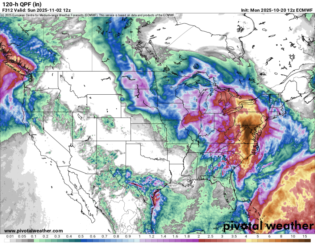 Rainfall amounts are quite staggering from the Monday, 12Z run of the Euro model for the 5-day period ending on Sunday, November 2nd. While these amounts are very likely to not actually verify, this model run certainly raises a red flag that the overall weather pattern later next week is full of potential. Map courtesy ECMWF, Pivotal Weather