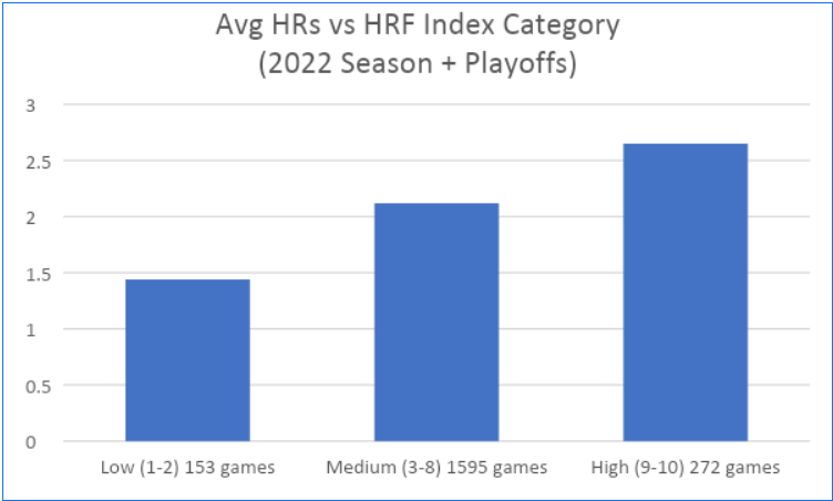 Our findings (summarized in the table below) show that for Low HRF Index values of 1 and 2, the percentage of games with less than 2 HRs was 61.43. If the Index averaged a 1 for an entire game, the percentage of games with less than 2 HRs was 61.62.