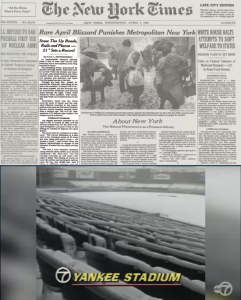 The early part of the 1982 baseball season was marred by plenty of cold and snow and the stretch of winter-like weather that April followed a stratospheric warming event in March that was pretty similar to the one we are currently experiencing over the polar region. The home openers for the Mets and Yankees were postponed several days due to a snowstorm on the 6th that generated a foot of snow in the New York City metro region. Newspaper article courtesy New York Times (top) and snow scene at Yankee Stadium (bottom) courtesy WABC (NYC, Channel 7).