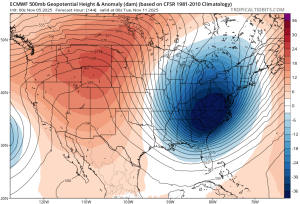 Vigorous low pressure aloft will play a big role in the instability (and snow) expected during this upcoming Arctic invasion. Map of Monday evening 500 mb height anomalies courtesy ECMWF, tropicaltidbits.com