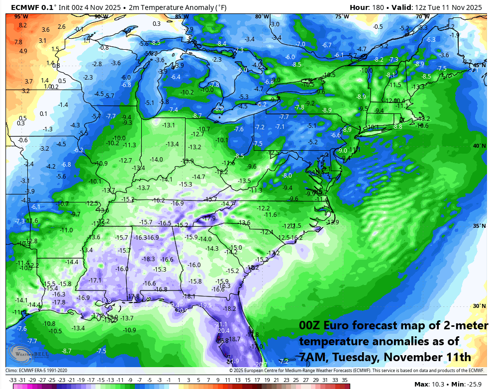 Arctic air will invade the eastern US early next week likely resulting in well below-normal temperatures all the way from Florida-to-Maine. Map courtesy ECMWF, Weather Bell Analytics