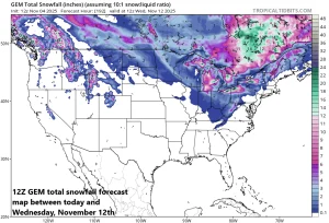 The Great Lakes “snow machine” may get turned on early next week with the arrival of Arctic air on top of some still relatively warm lake waters. Snow is also a possibility across interior sections of the Northeast and New England and could extend down to the Appalachian Mountains into the Tennessee Valley and even the I-95 corridor might see some snow shower activity. Map courtesy Canadian Met Centre, tropicaltidbits.com